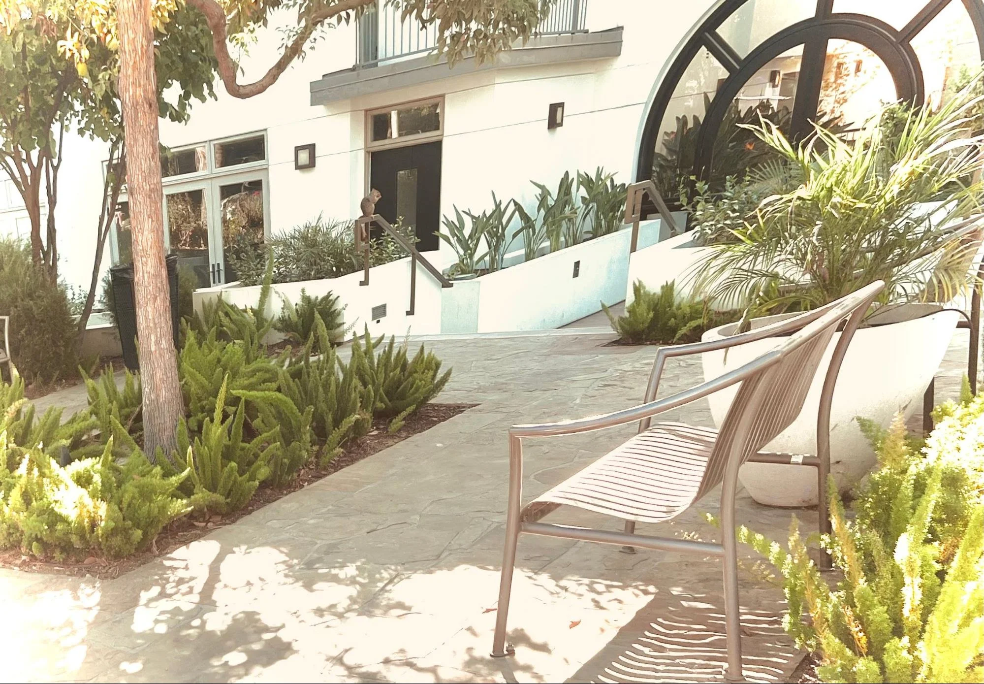 Upon arrival for the first time, I will come out and meet you on the south side of San Pasqual St near the benches pictured below. Please call me as soon as you park so I can best escort you in.